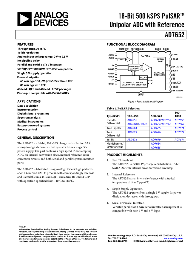 AD7652 16-Bit 500 kSPS PulSAR Unipolar ADC with Ref
