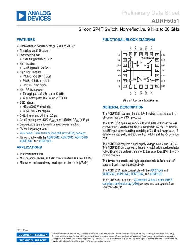 ADRF5051 Silicon SP4T Switch, Nonreflective, 9 kHz to 20 GHz