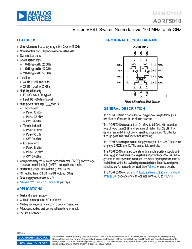 ADRF5010 Silicon SPST Switch, NonReflective, 100 MHz to 55 GHz