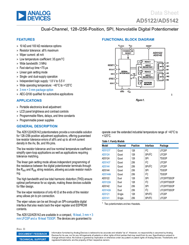 AD5122 Dual Channel, 256-Position, SPI, Nonvolatile Digital Potentiometer
