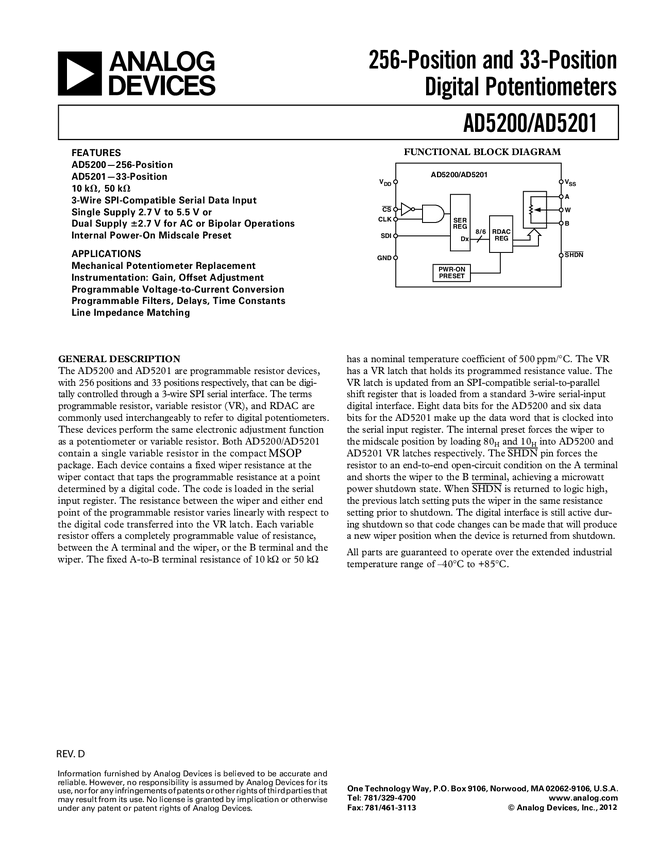 AD5201 33-Position Digital Potentiometer