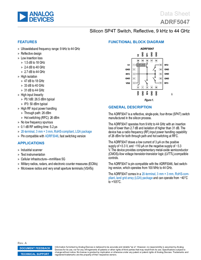 ADRF5047 Silicon SP4T Switch, Reflective, 9 kHz to 44 GHz