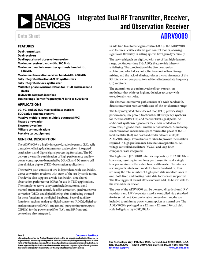 ADRV9009 Integrated Dual RF Tx, Rx, and Observation Rx