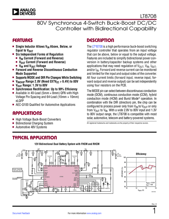 LT8708 80V Synchronous 4-Switch Buck-Boost DC/DC Controller with Bidirectional Cap...