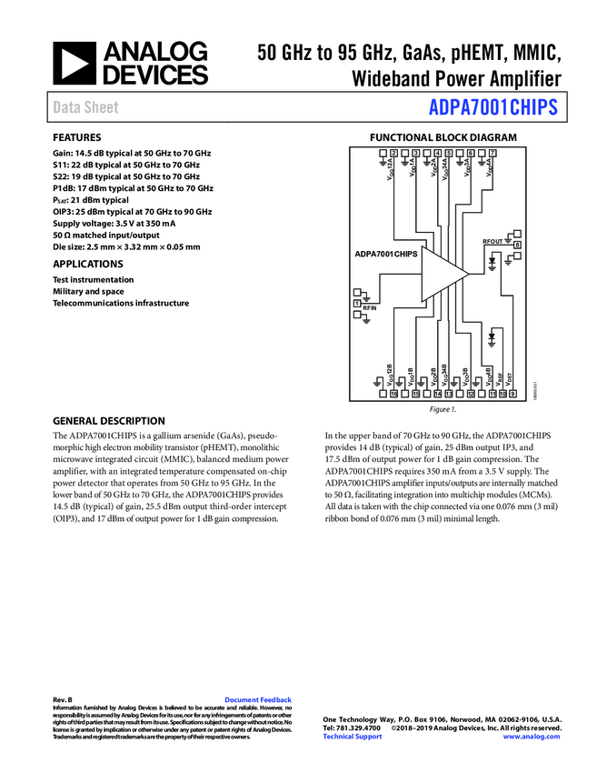 ADPA7001-Die 50 GHz to 95 GHz, GaAs, pHEMT, MMIC, Wideband Power Amplifier