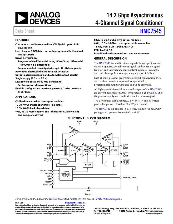 HMC7545 14.2 Gbps Asynchronous 4-Channel Signal Conditioner