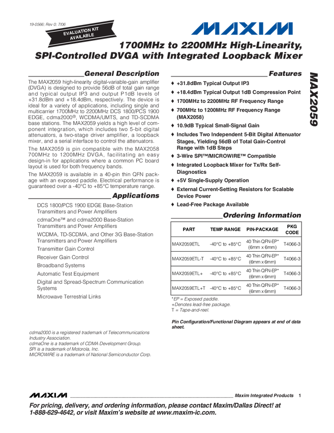 MAX2059 1700MHz to 2200MHz, High-Linearity, SPI-Controlled DVGA with Integrated Loo...