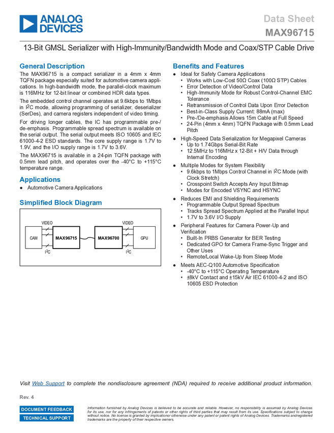 MAX96715 13-Bit GMSL Serializer with High-Immunity/ Bandwidth Mode and Coax/STP Cabl...