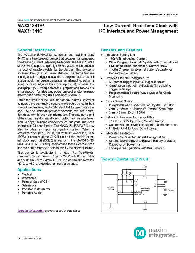 MAX31341B Low-Current, Real-Time Clock with IC Interface and Power Management