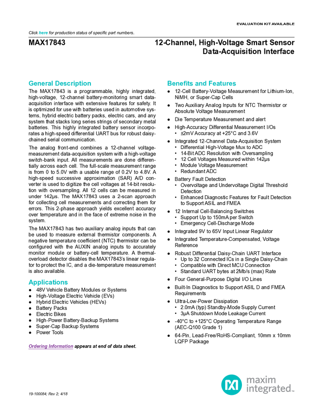 MAX17843 12-Channel, High-Voltage Smart Sensor Data-Acquisition Interface