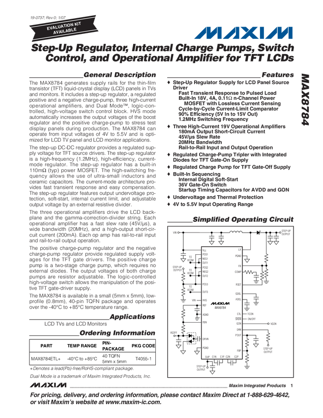 MAX8784 Step-Up Regulator, Internal Charge Pumps, Switch Control, and Operational A...