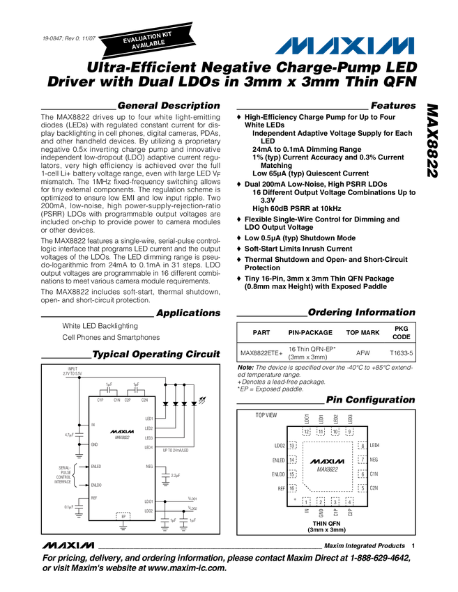 MAX8822 Ultra-Efficient Negative Charge-Pump LED Driver with Dual LDOs in 3mm x 3mm...