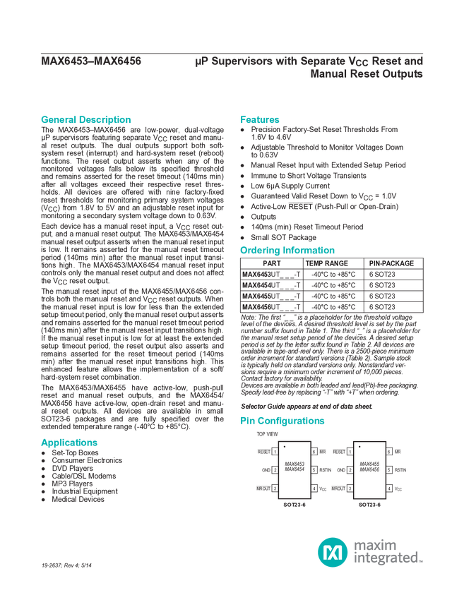 MAX6453 µP Supervisors with Separate V Reset and Manual Reset Outputs
