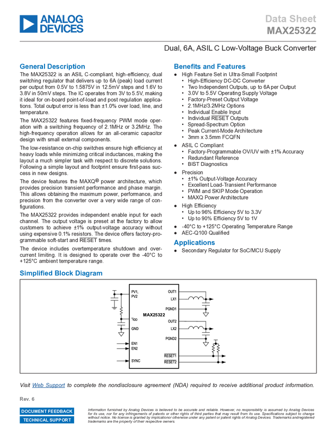 MAX25322 Dual, 6A, ASIL-C Low Voltage Buck Converter