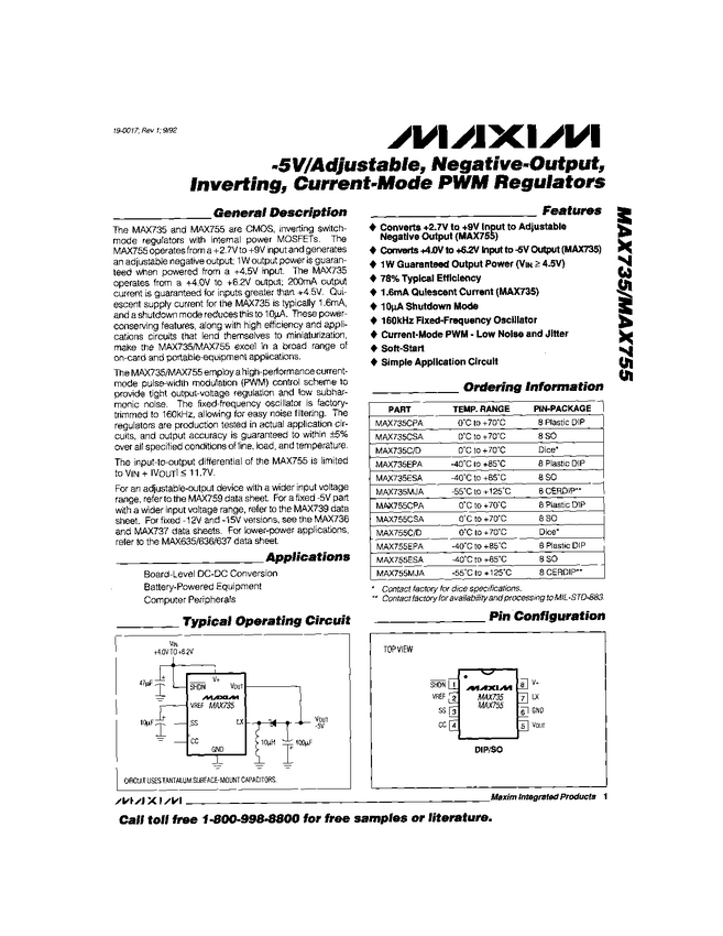 MAX755 -5V, Inverting, PWM DC-DC Converter