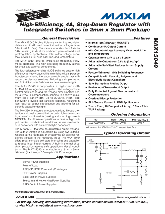 MAX15040 High-Efficiency, 4A, Step-Down Regulator with Integrated Switches in 2mm x...