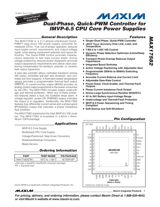 MAX17582 Dual-Phase, Quick-PWM Controller for IMVP-6.5 CPU Core Power Supplies