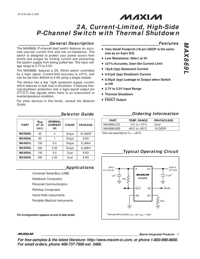MAX869L 2A, Current-Limited, High-Side P-Channel Switch with Thermal Shutdown