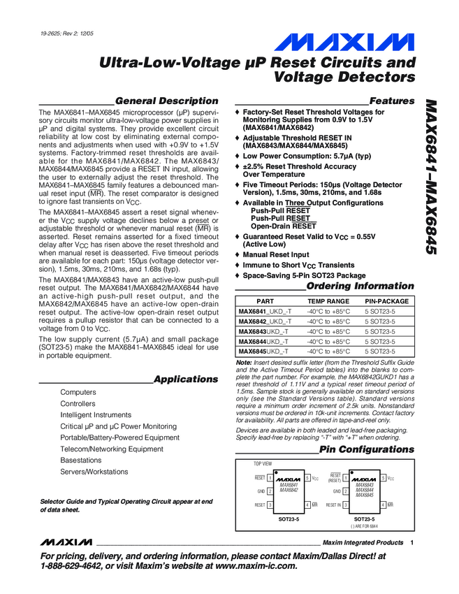 MAX6841 Ultra-Low-Voltage µP Reset Circuits and Voltage Detectors