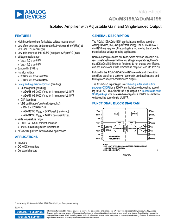 ADUM3195 Isolated Amplifier with Adjustable Gain and Single-Ended Output