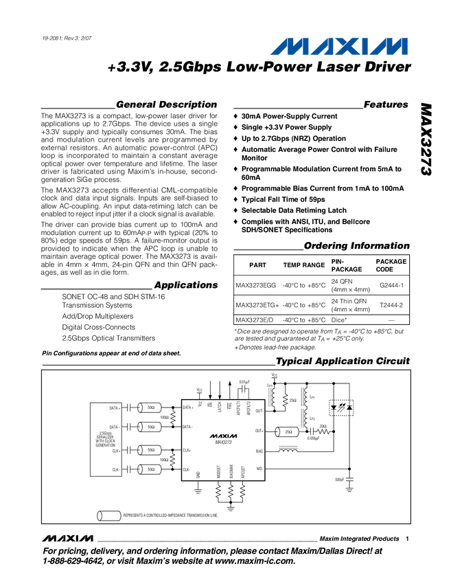 MAX3273 +3.3V, 2.5Gbps Low-Power Laser Driver