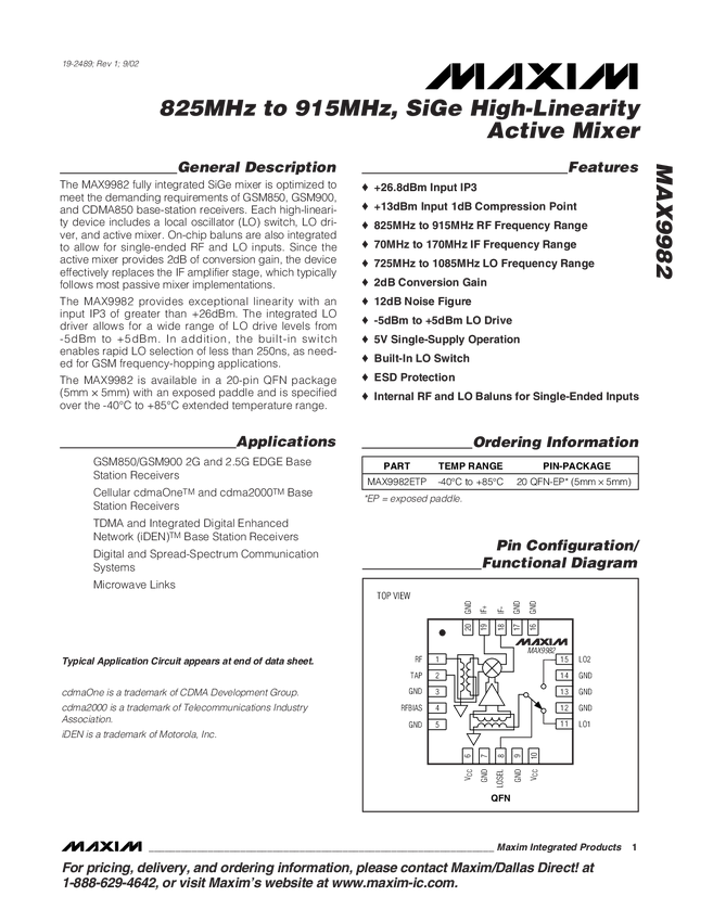 MAX9982 825MHz to 915MHz, SiGe High-Linearity Active Mixer