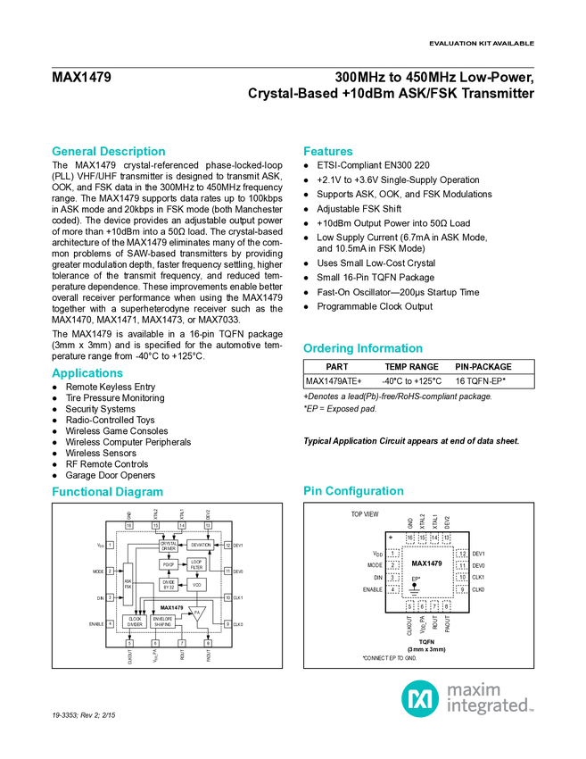 MAX1479 300MHz to 450MHz Low-Power, Crystal-Based +10dBm ASK/FSK Transmitter