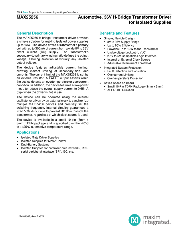 MAX25256 Automotive, 36V H-Bridge Transformer Driver for Isolated Supplies