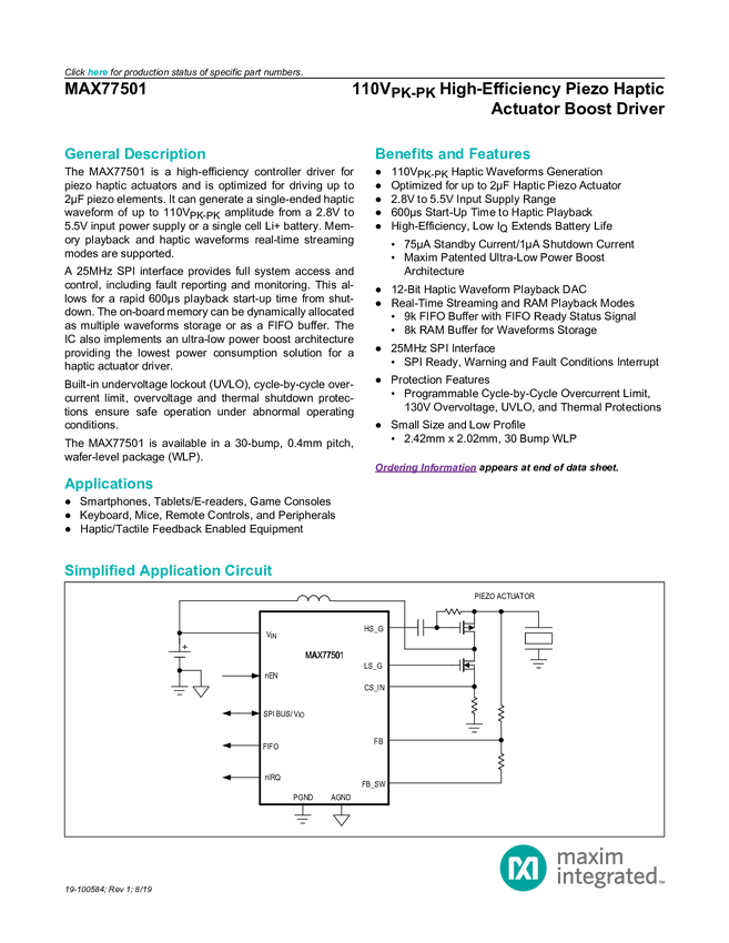 MAX77501 110V High-Efficiency Piezo Haptic Actuator Boost Driver