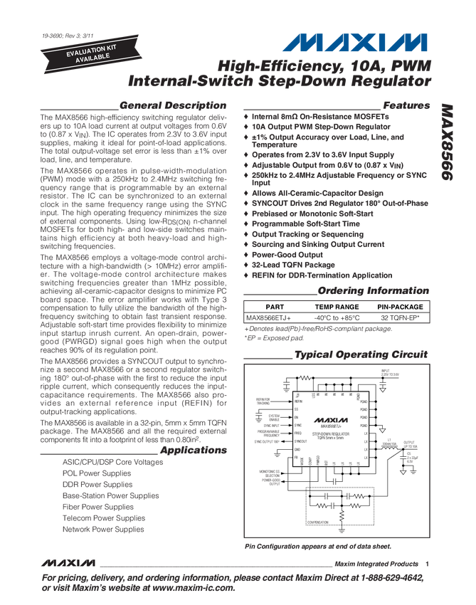 MAX8566 High-Efficiency, 10A, PWM Internal-Switch Step-Down Regulator
