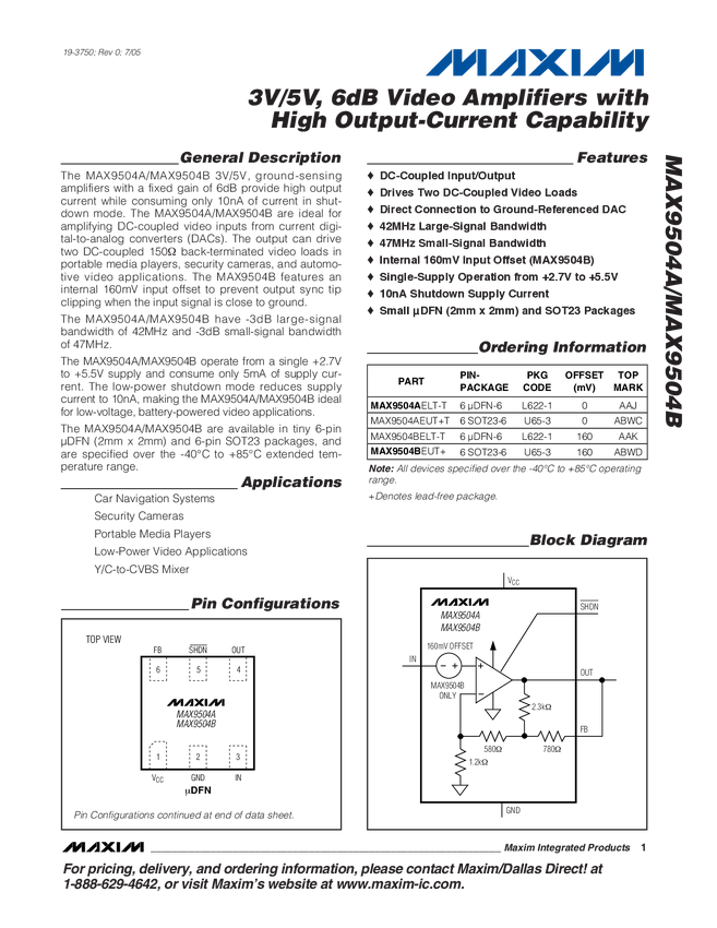 MAX9504A 3V/5V, 6dB Video Amplifiers with High Output-Current Capability