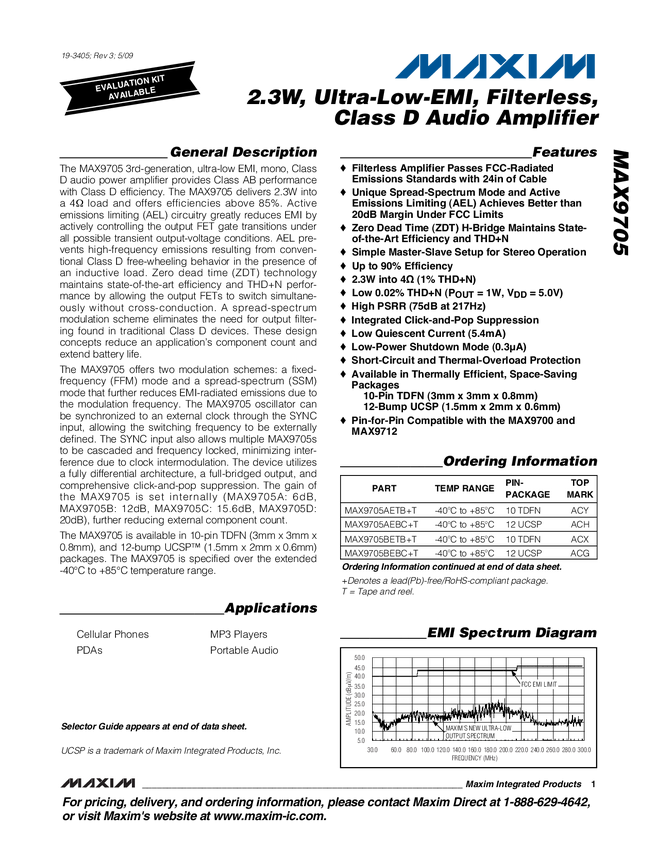 MAX9705 2.3W, Ultra-Low-EMI, Filterless, Class D Audio Amplifier