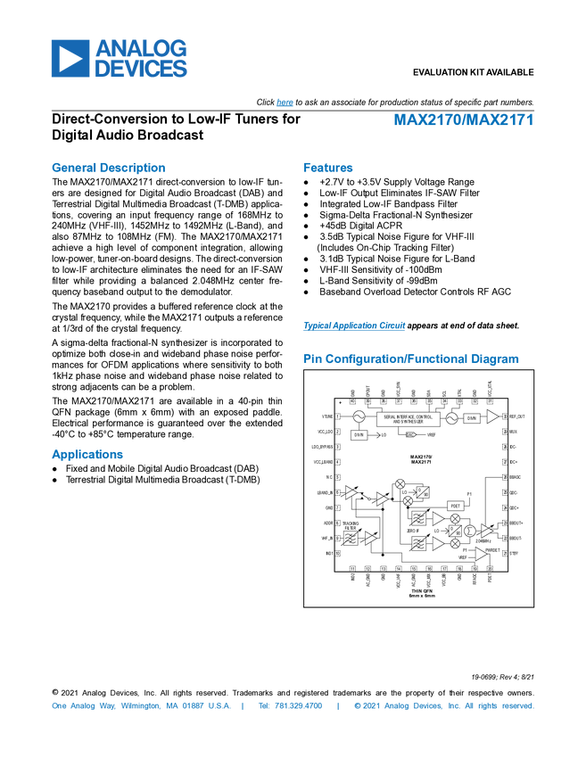 MAX2171 Direct-Conversion to Low-IF Tuners for Digital Audio Broadcast