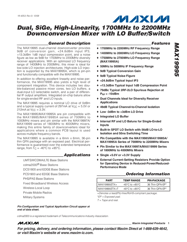 MAX19995 Dual, SiGe, High-Linearity, 1700MHz to 2200MHz Downconversion Mixer with LO...