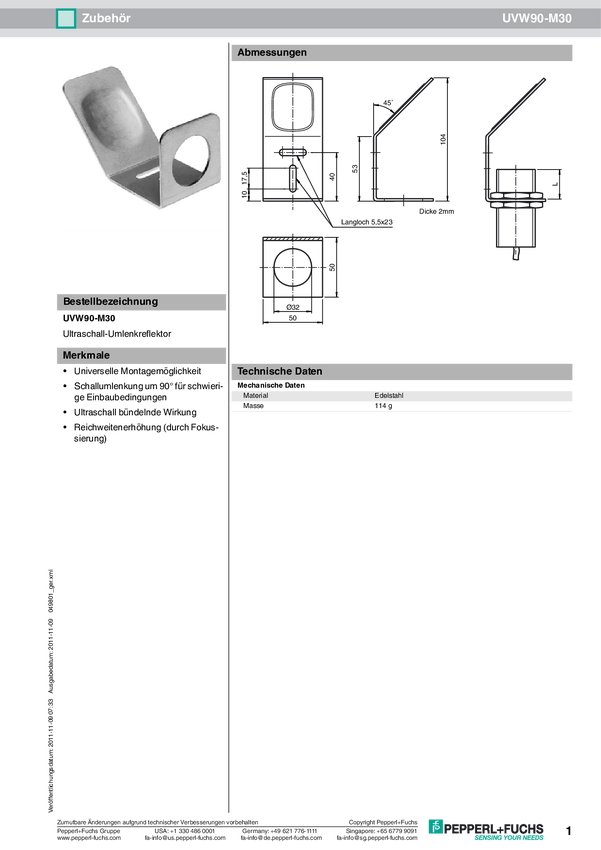 Pepperl+Fuchs 049801 Odbłyśnik reflektora ultradźwiękowego UVW90-M30 1 szt.
