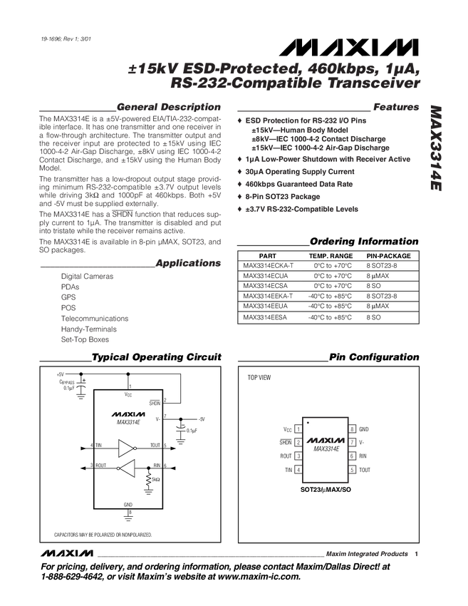 MAX3314E ±15kV ESD-Protected, 460kbps, 1µA, RS-232-Compatible Transceiver