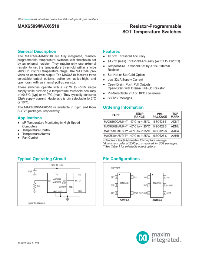 MAX6510 Resistor-Programmable SOT Temperature Switches