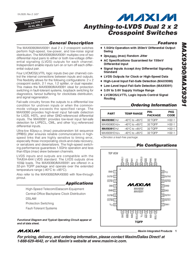 MAX9391 Anything-to-LVDS Dual 2 x 2 Crosspoint Switches