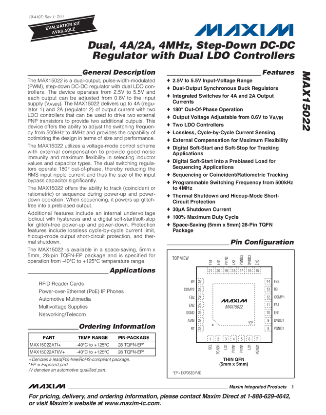 MAX15022 Dual, 4A/2A, 4MHz, Step-Down DC-DC Regulator with Dual LDO Controllers