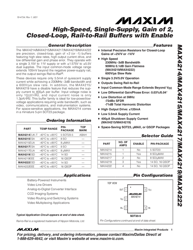 MAX4219 High-Speed, Single-Supply, Gain of 2, Closed-Loop, Rail-to-Rail Buffers wit...