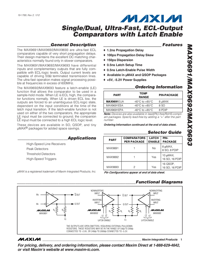 MAX9691 Single/Dual, Ultra-Fast, ECL-Output Comparators with Latch Enable