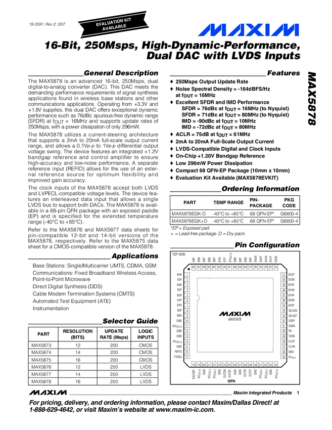 MAX5878 16-Bit, 250Msps, High-Dynamic-Performance, Dual DAC with LVDS Inputs