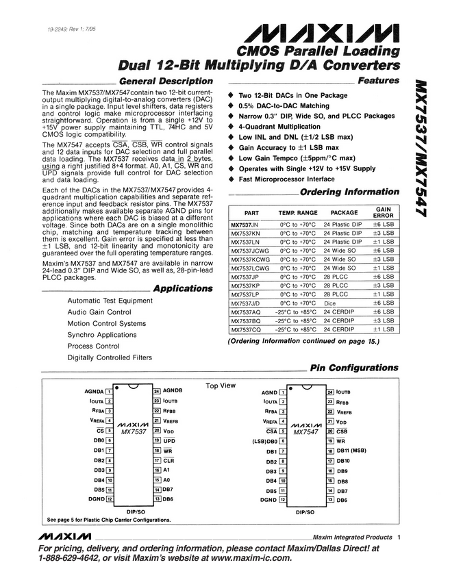 MX7547 CMOS, Parallel Loading, Dual, 12-Bit Multiplying DAC