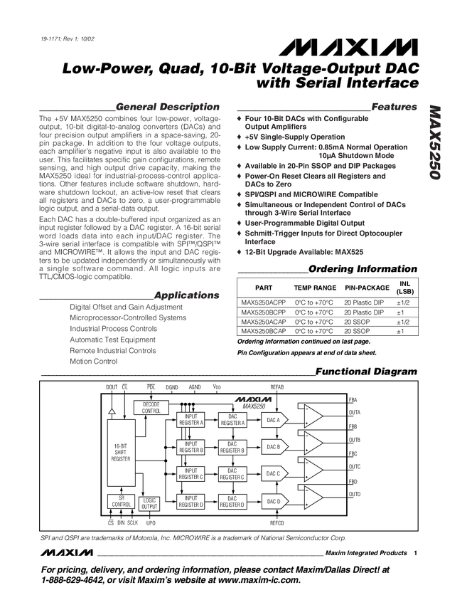 MAX5250 Low-Power, Quad, 10-Bit Voltage-Output DAC with Serial Interface