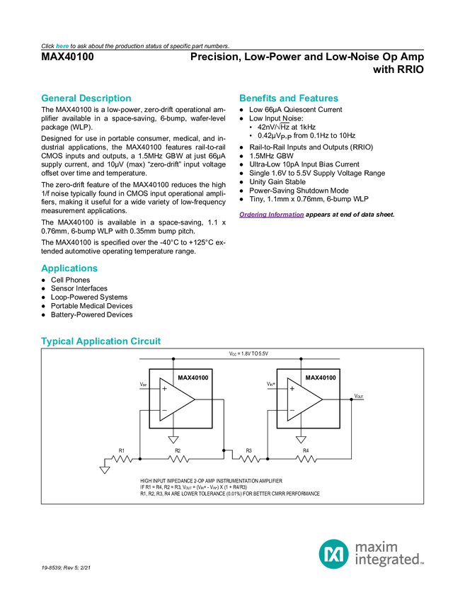 MAX40100 Precision, Low-Power, and Low-Noise Op Amp with RRIO