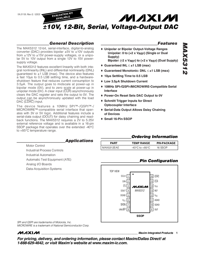 MAX5312 ±10V, 12-Bit, Serial, Voltage-Output DAC