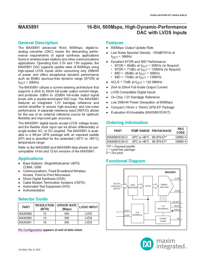 MAX5891 16-Bit, 600Msps, High-Dynamic-Performance DAC with LVDS Inputs