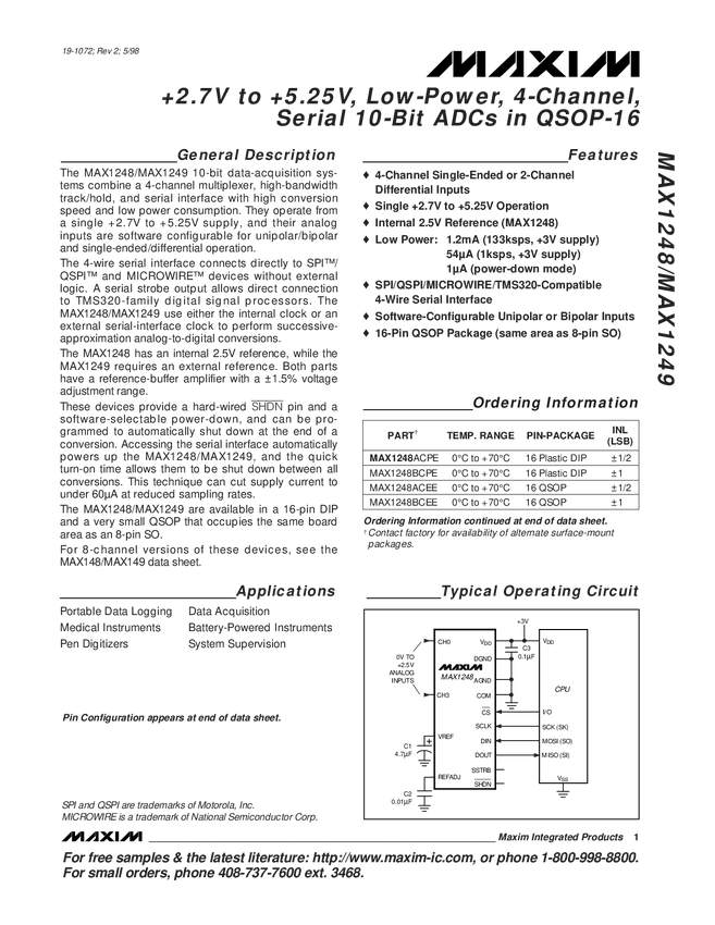 MAX1249 +2.7V to +5.25V, Low-Power, 4-Channel, Serial, 10-Bit ADCs in QSOP-16