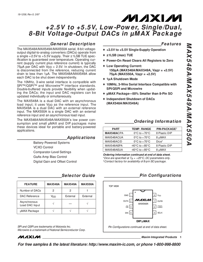 MAX548A +2.5V to +5.5V, Low-Power, Single/Dual, 8-Bit Voltage-Output DACs in µMAX P...