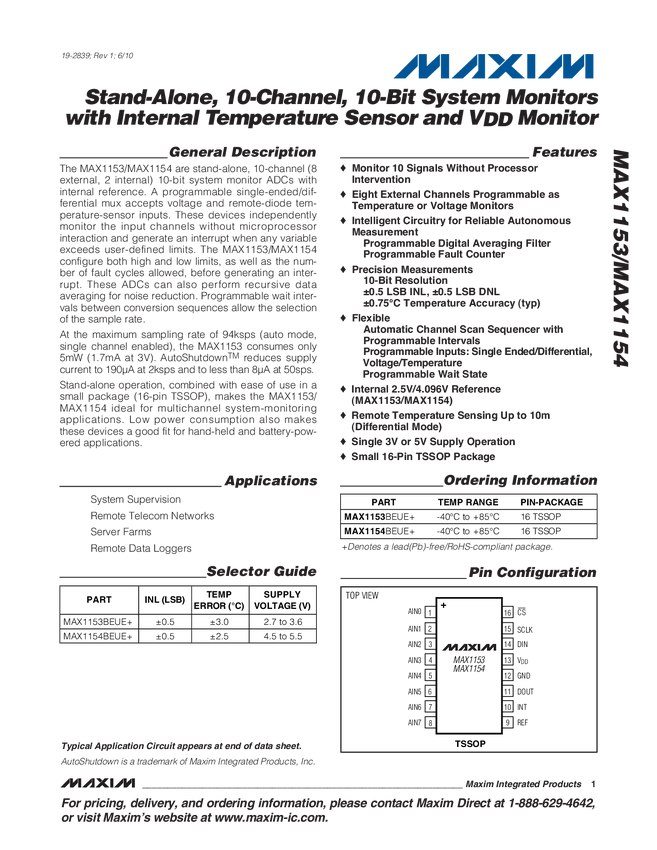 MAX1153 Stand-Alone, 10-Channel, 10-Bit System Monitors with Internal Temperature S...